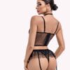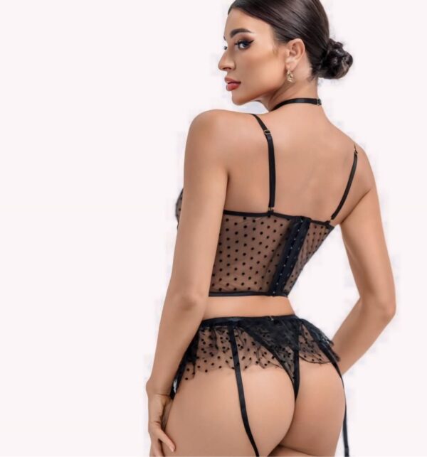 Afrodite Set: Lingerie set with bra and thong. The bra is crop top style, made of polka dot tulle with golden chains on the neckline. The thong is also made of polka dot tulle, has cotton lining, and is adjustable on the sides. Comes with a matching garter belt to add a sexy touch. 80% polyamide, 20% elastane.