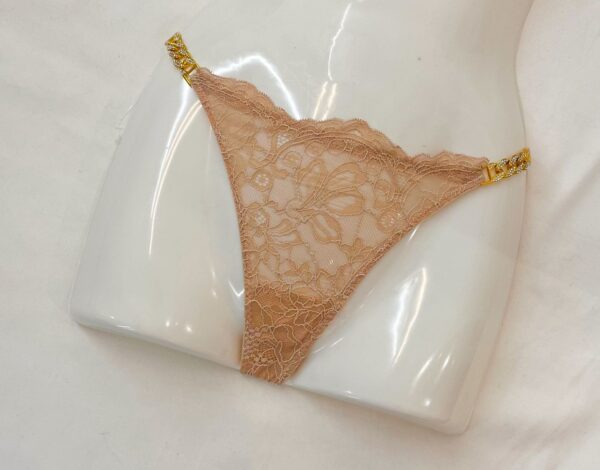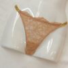Aisa Thong: Lace thong with a cotton lining. It features golden jewelry details with rhinestones on the sides. 90% polyamide, 10% elastane. It is recommended to wash by hand and with neutral soap.