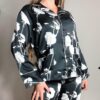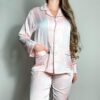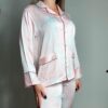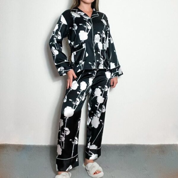 Satin pajamas with prints. The fabric is comfortable and soft. The top is a shirt style with pockets and buttons with shiny details. The pants have an elastic waistband for a proper fit. 97% polyester, 3% elastane.