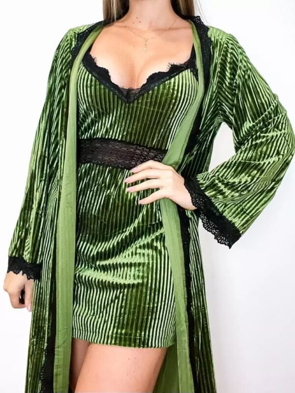 SET CHANEL: Matching velvet nightgown + robe set. Short nightgown with adjustable straps and black lace details. Robe with black lace details. Super elegant and sexy. 95% polyester, 5% elastane.