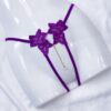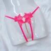 Side-tie thong with an open bottom, featuring lace flower details both front and back. It includes a golden pendant in the center with a pearl and sparkle at the tip.