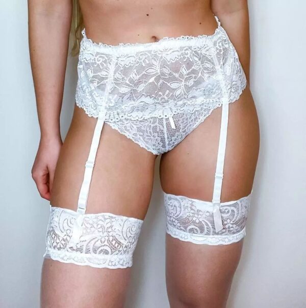 Porte-jarretelles en dentelle noire avec détails transparents, modèle plus large, avec fermeture régulatrice à l’arrière. 88 % nylon, 12 % élasthanne.