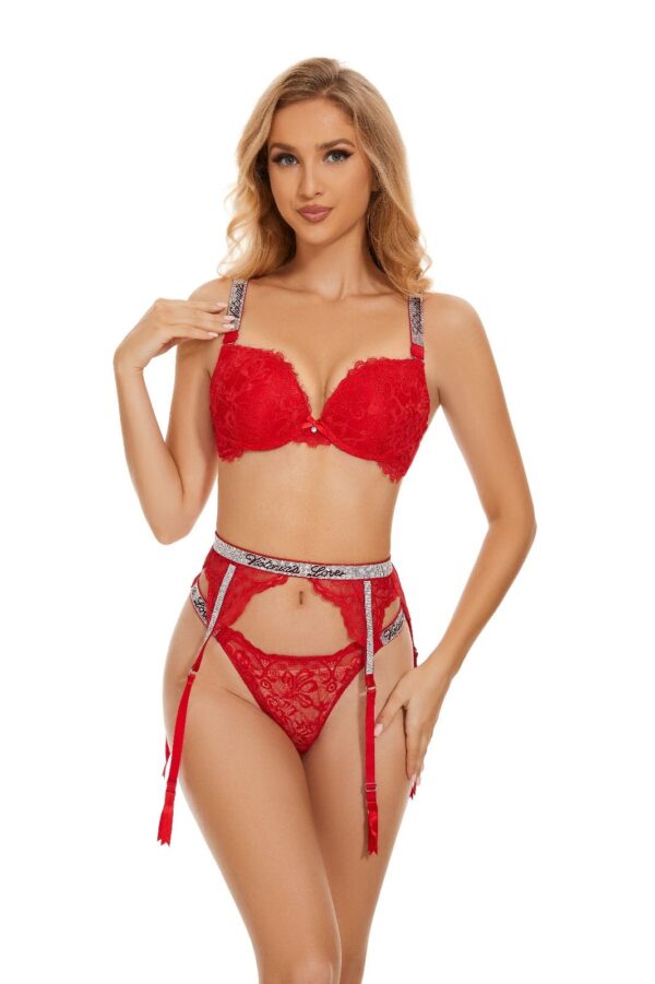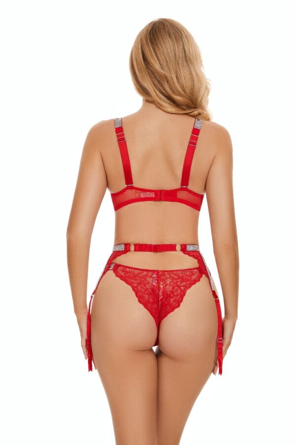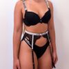 Ensemble Victoria Lover : Un ensemble conçu pour se démarquer. La culotte en dentelle est dotée de bretelles latérales ornées de diamants, ajoutant une touche de lumière et de sensualité. Le soutien-gorge, avec un rembourrage doux et de la dentelle florale, intègre également des détails scintillants sur les bretelles, alliant élégance et style. La tenue est complétée par un porte-jarretelles en dentelle assorti, également orné de diamants. Idéal pour celles qui recherchent une lingerie sophistiquée et sexy avec une touche de glamour. 90 % Polyamide – 10 % Élasthanne